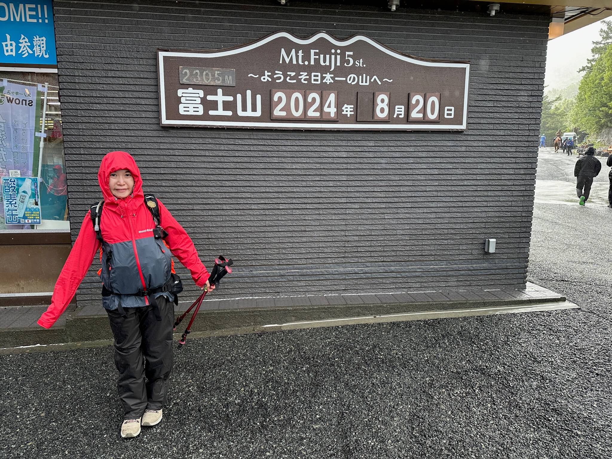 我們這次選擇的是最親民的「吉田路線」上山。那天一早從河口湖車站搭巴士上山,結果天氣有點不太好,巴士快到五合目的時候,外面居然開始下大雨還颳大風!我們一下巴士就趕快跑到商店裡躲雨,在廁所手忙腳亂地換上雨衣雨褲,快速買了一根短的金剛杖,匆匆拍了幾張紀念照後,就準備起登了。