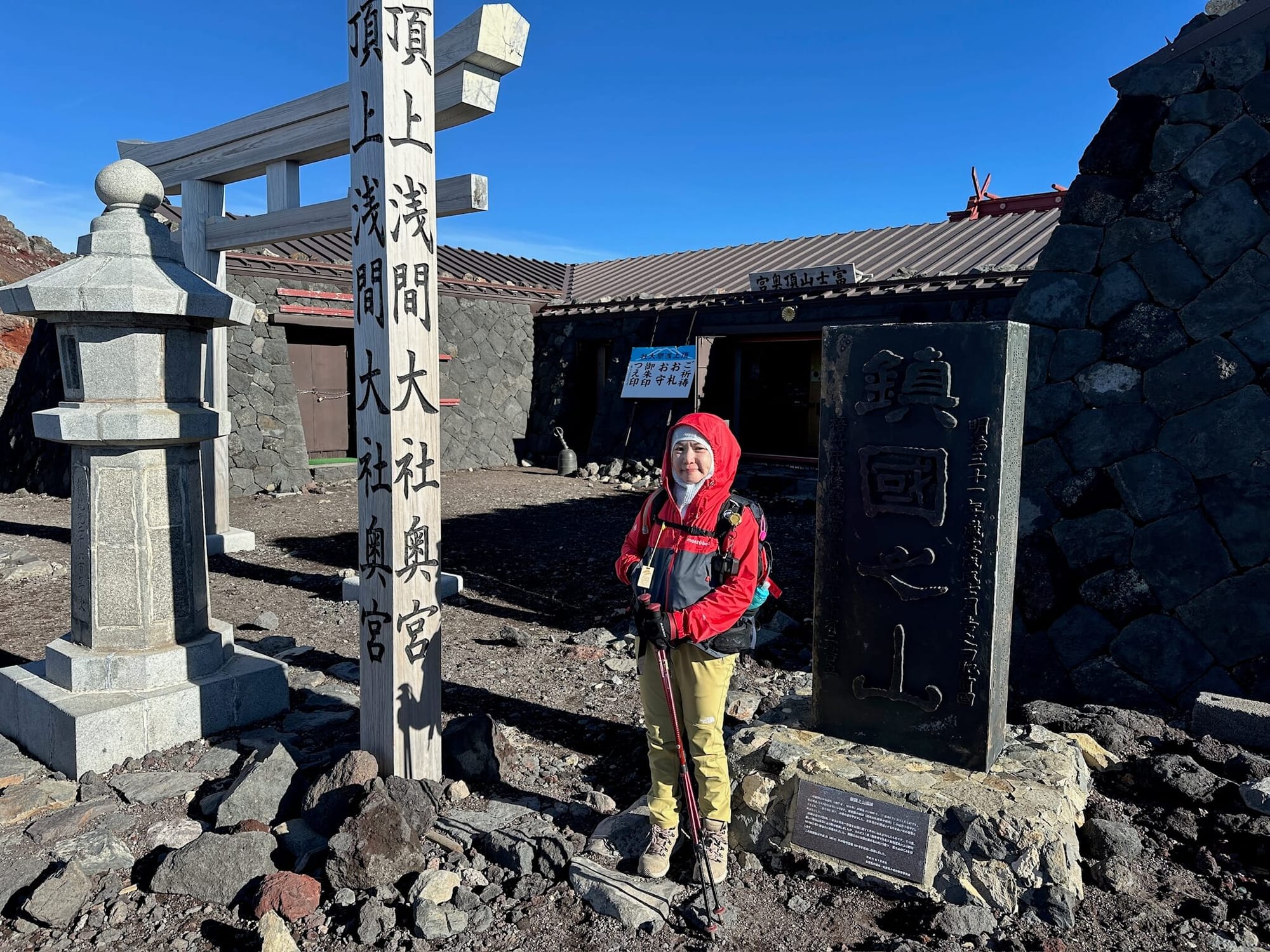 看完御來光,我們繼續往山頂前進。這時候往上一看才發現,其實我們離山頂超級近了,只要再走個 15 分鐘左右就到達了!一上到山頂,完全是另一種氛圍,滿滿的人潮!我們先到頂上的淺間大社,替我們的金剛杖蓋上印章,接著採購各式各樣的御守,每個都做工好精緻好漂亮,一定要買幾個來紀念一下。週邊的山小屋也販賣不少紀念品和明信片,可惜我們來的時候郵局已經停止營業,沒辦法寄明信片了,不過這小小的遺憾完全不影響我的好心情。