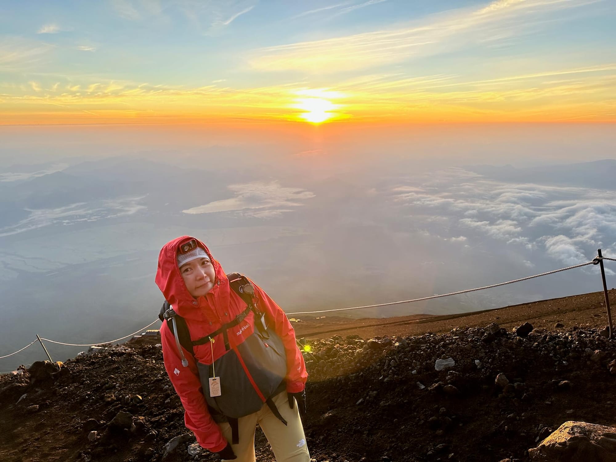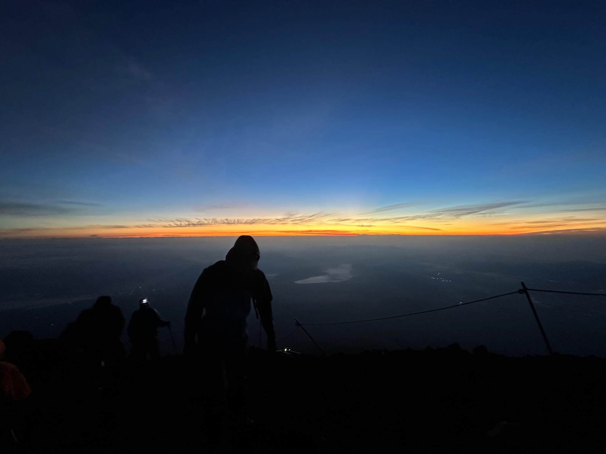 不知道又走了多久,天色也慢慢開始亮起來,這時候就知道應該是來不及趕到山頂看御來光了。我們就找了一個比較寬敞、有石頭可以坐的地方,卸下包包、拿出手機,準備等日出。雖然等待的時間只有短短的 20 分鐘,但在身體沒在活動的情況下真的好冷,趕快拿出乾糧邊吃邊補充熱量,一邊耐心等著御來光的出現。看著太陽緩緩地從地平線上升,天空那種從深藍變到紅橘色的變化,真的好美好感動!那一刻我才明白,原來這就是日本人視為吉兆和賜福的「御來光」,親眼看到真的非常值得。