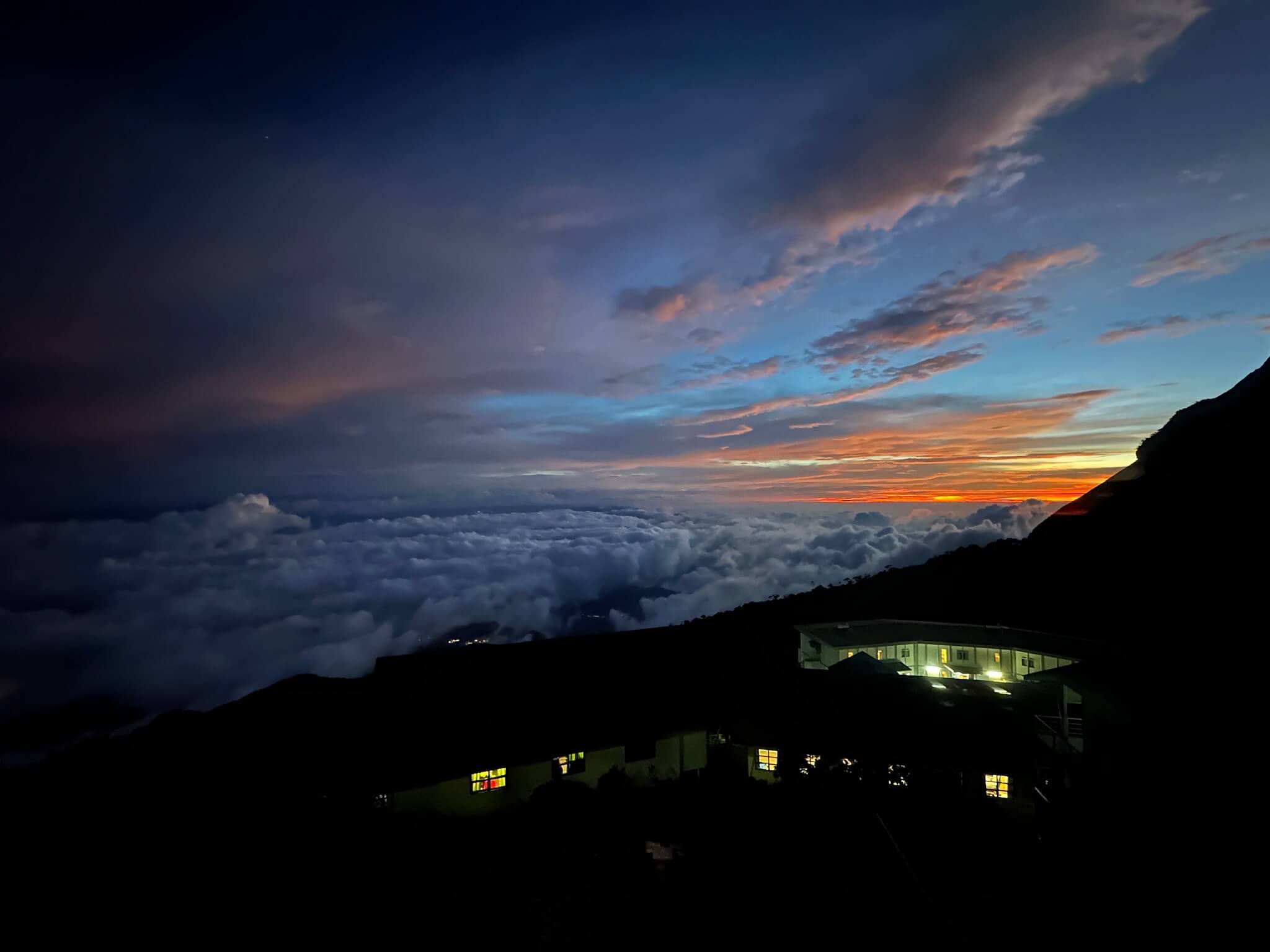 晚餐在隔壁的 Laban Rata 小屋享用,這裡採自助式,菜色非常多樣,從主食、湯品到甜點和水果應有盡有。能在山上吃到這麼豐盛的晚餐,真的非常開心。吃飽後我走到外面的露台,正好是太陽下山的時間,景色很美。這裡也有個小小的販賣部,有少量的保暖衣物、襪子、手套、電池等,萬一有少帶什麼東西,也能緊急購買。