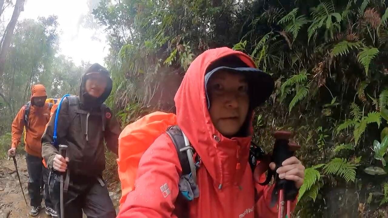 剛開始有一小段下坡,經過一個小瀑布後,便開始一路爬升。沿路都是黃土和石頭路,林相和台灣的中級山有些相似。剛開始坡度平緩,還不覺得特別辛苦,山導走第一個,教我們如何踩點,一步一步慢慢走。經過第一個涼亭時,天氣變得有點陰,山導跟我們確認是否帶了雨衣,並建議先把背包套裝好。果然沒多久就開始下雨,還好我們距離第二個涼亭不遠,馬上進去躲雨,並換上雨衣雨褲。山導見怪不怪地拿出大傘,看來這裡的天氣果真多變。接下來的路途,山導都走在隊伍最後,讓我們自行配速。雨越下越大,路徑開始出現小積水和爛泥,走的時候必須很小心,深怕一不注意就會滑倒。