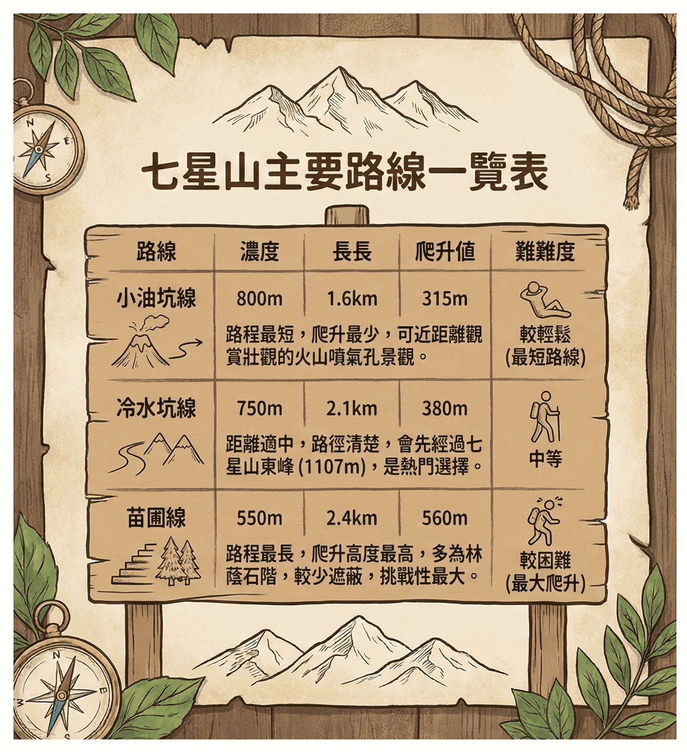 若你是爬山新手,第一次想走七星山,建議可以依照自己的體能和時間做路線選擇: