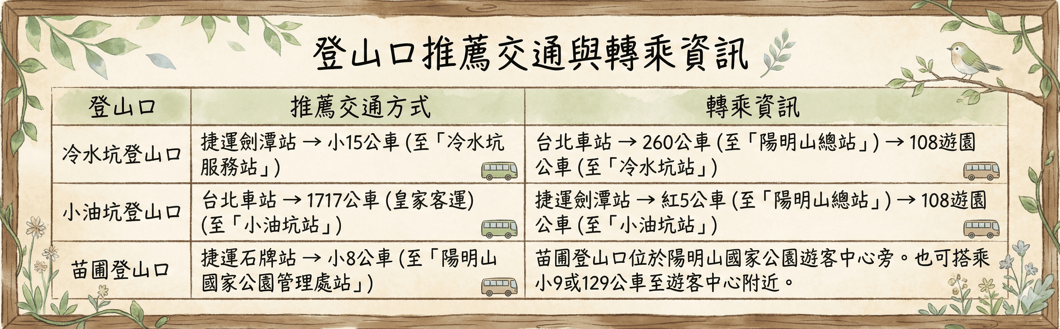 - 夏季挑戰: 若走冷水坑和小油坑路線,完全沒有遮蔽物,防曬和補水一定要做好,不然就是選擇苗圃路線會比較不曬。