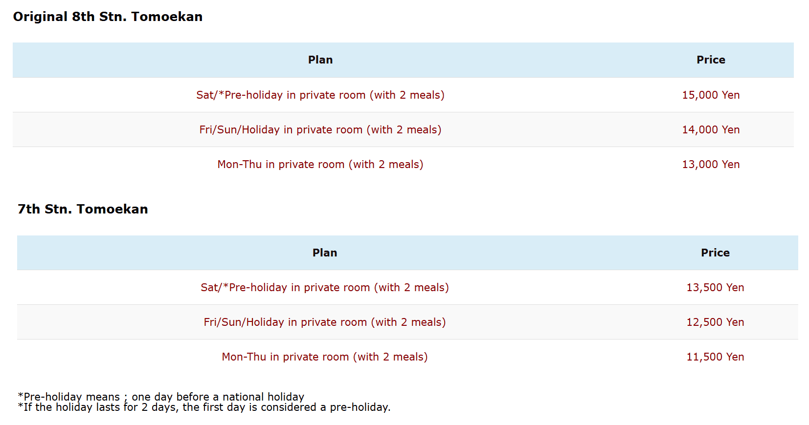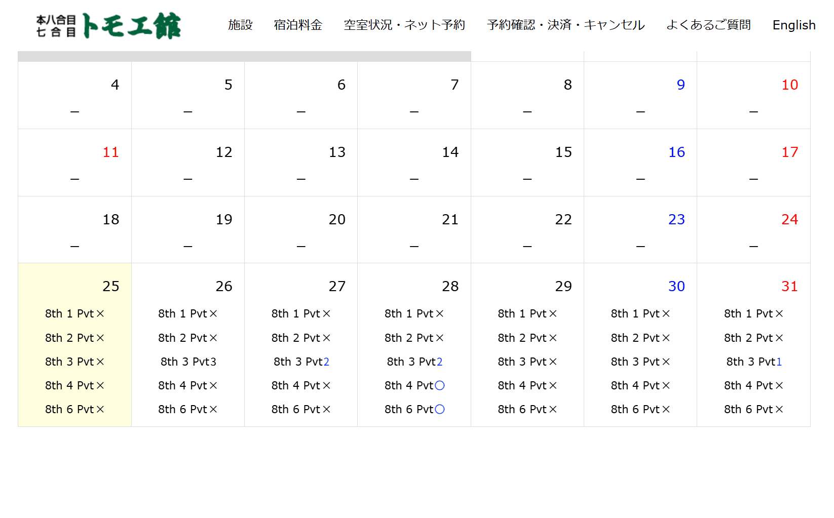 網站介面其實滿簡單的,從左到右分別是:設施介紹、住宿費用、空房狀況與預約、預約確認與付款、還有常見問題。雖然也有英文版,但介紹比較簡略,建議大家還是可以點進日文版,用翻譯軟體搭配圖片,會看得更清楚。