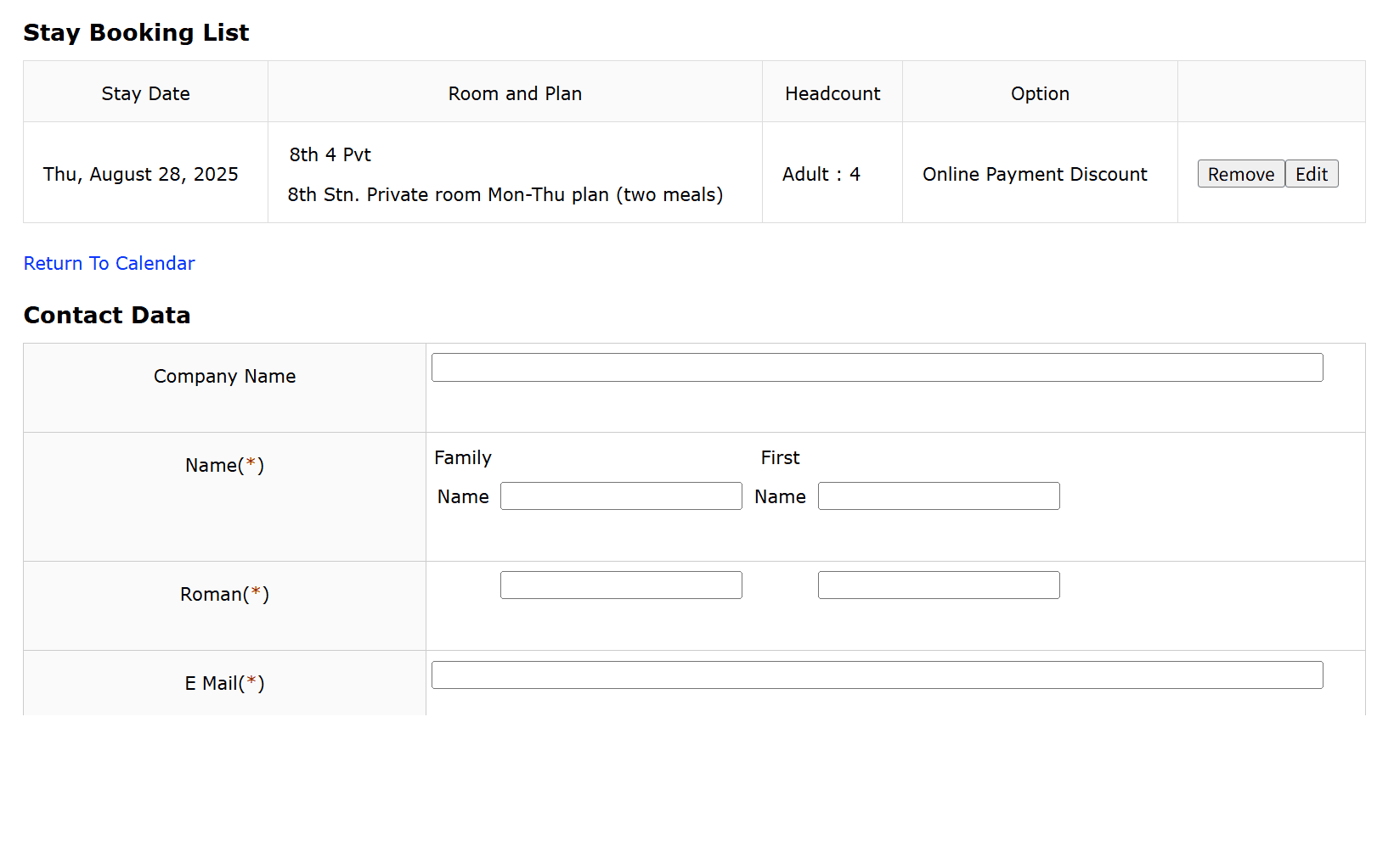 點進英文頁面可以直接預訂。從月曆就可以看到個室數量,從一人到六人房都有。看到「X」就是沒房間了,「O」代表還有空位,數字則是剩餘房間數。點選想要的個室,就能進入預訂頁面。