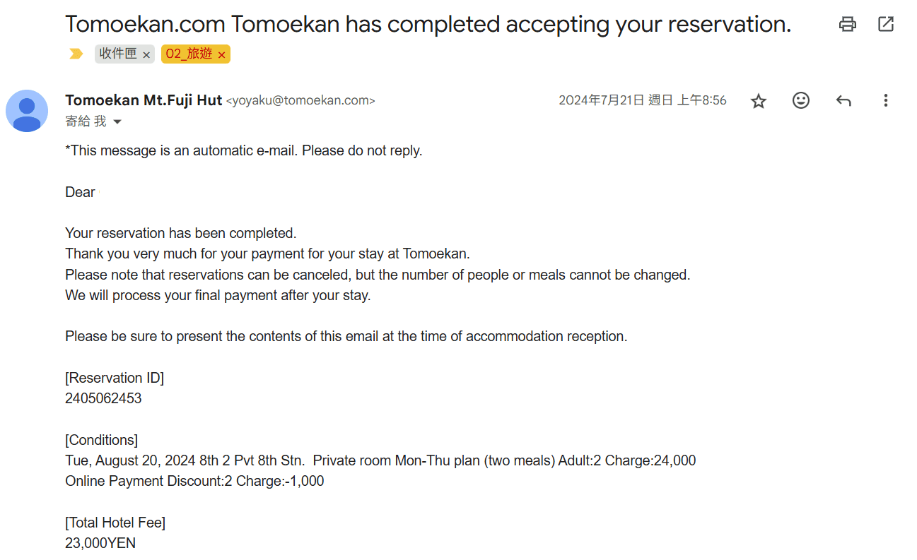 預約成功後,信箱會收到一封確認信,裡面也會有你的 Reserve ID。點選信裡的預約查詢連結,或是官網上的「預約確認與付款」,輸入資料後就能進入付款頁面。