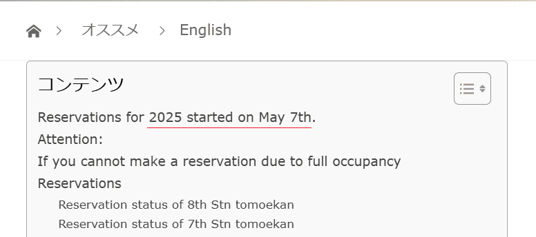 每年5月份時會開放訂房,可以先到網站確認每年的開放預訂日期,日本時間午夜12點(臺灣時間晚上11點)開放預訂,但這兩年都有發現他們會偷跑,有時候晚上10點40分就可以預訂,可以提早一點時間上去看看。